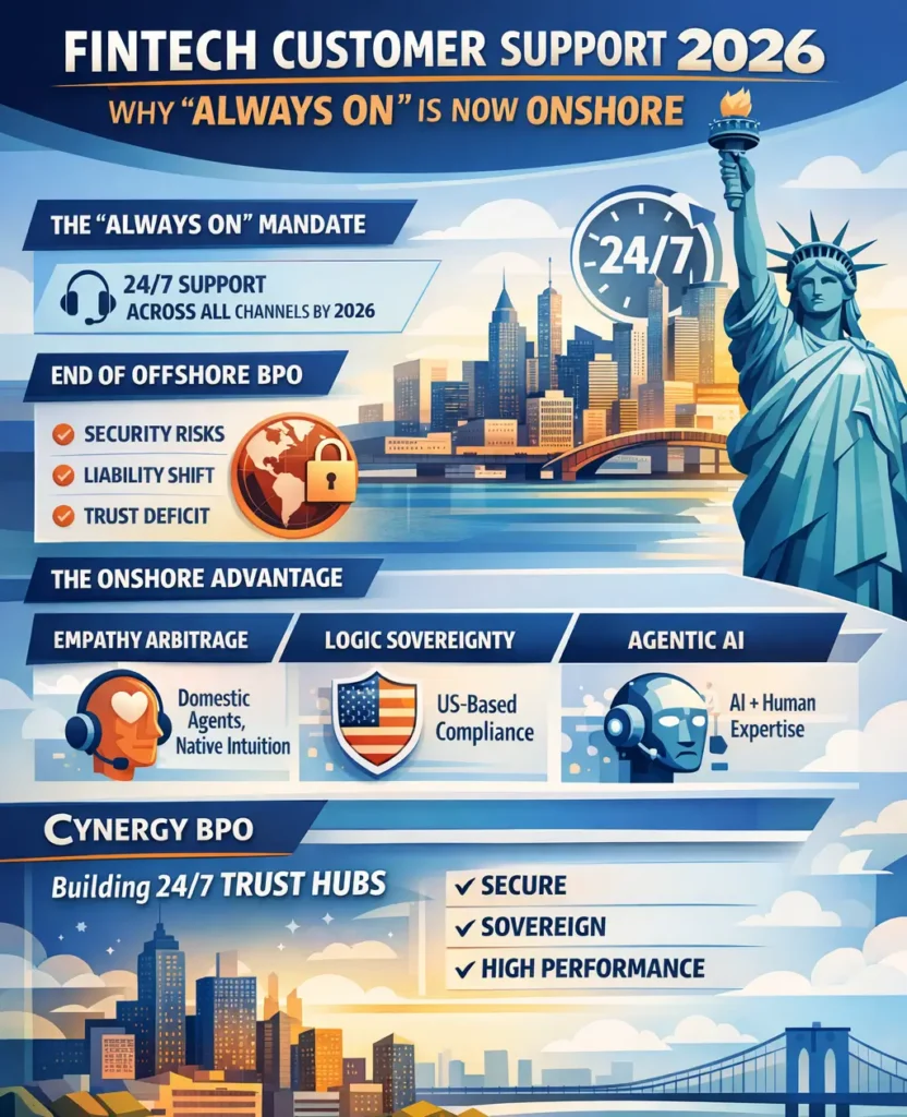 This infographic breaks down why 24/7 fintech customer support in 2026 has shifted from offshore cost models to sovereign onshore hubs—leveraging Empathy Arbitrage, Logic Sovereignty, and Agentic AI to deliver secure, compliant, and trust-centric “Always On” support on US soil.