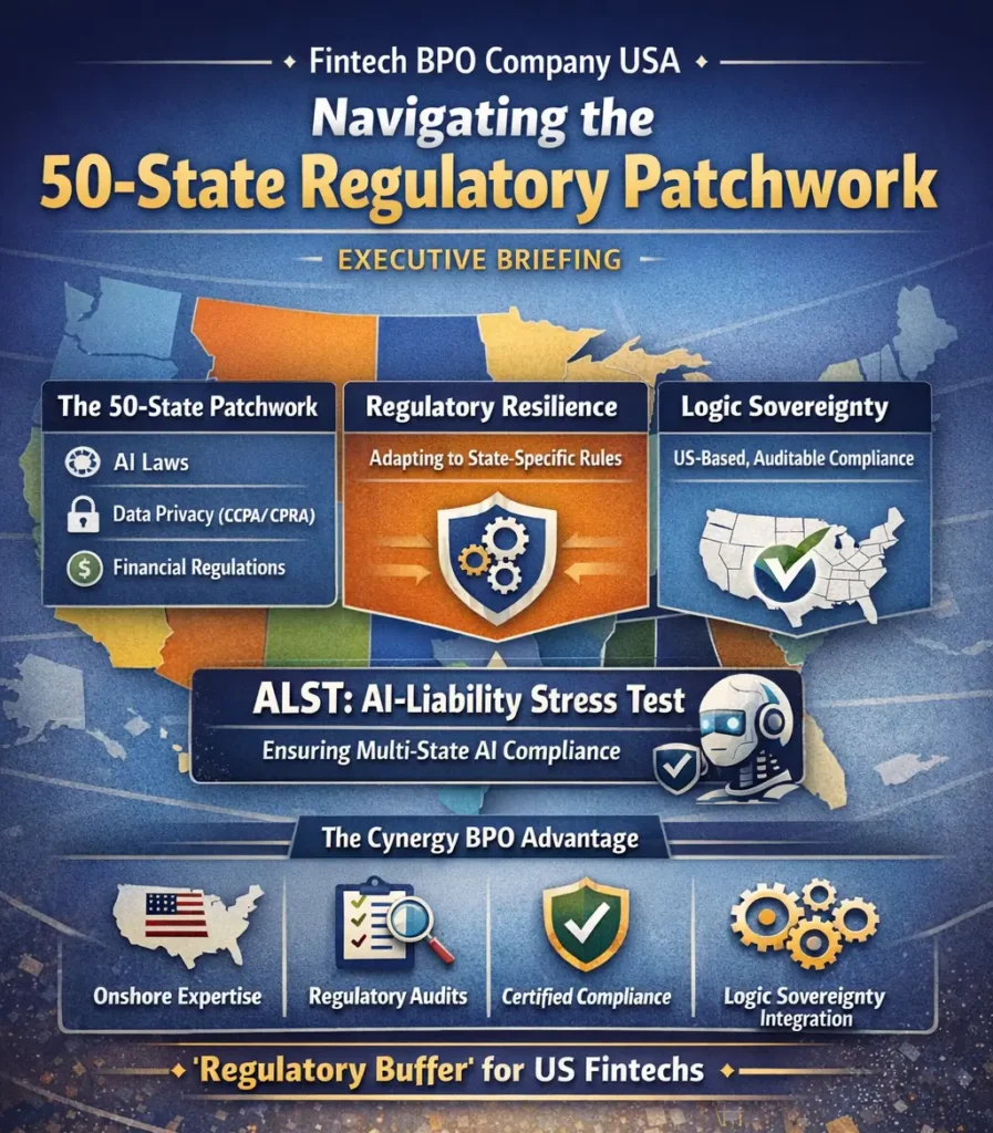 This infographic breaks down how a US-based fintech BPO can navigate the 50-State regulatory patchwork through Regulatory Resilience, Logic Sovereignty, and ALST-driven AI stress testing to ensure auditable, multi-state compliant, and SEC-ready operations.